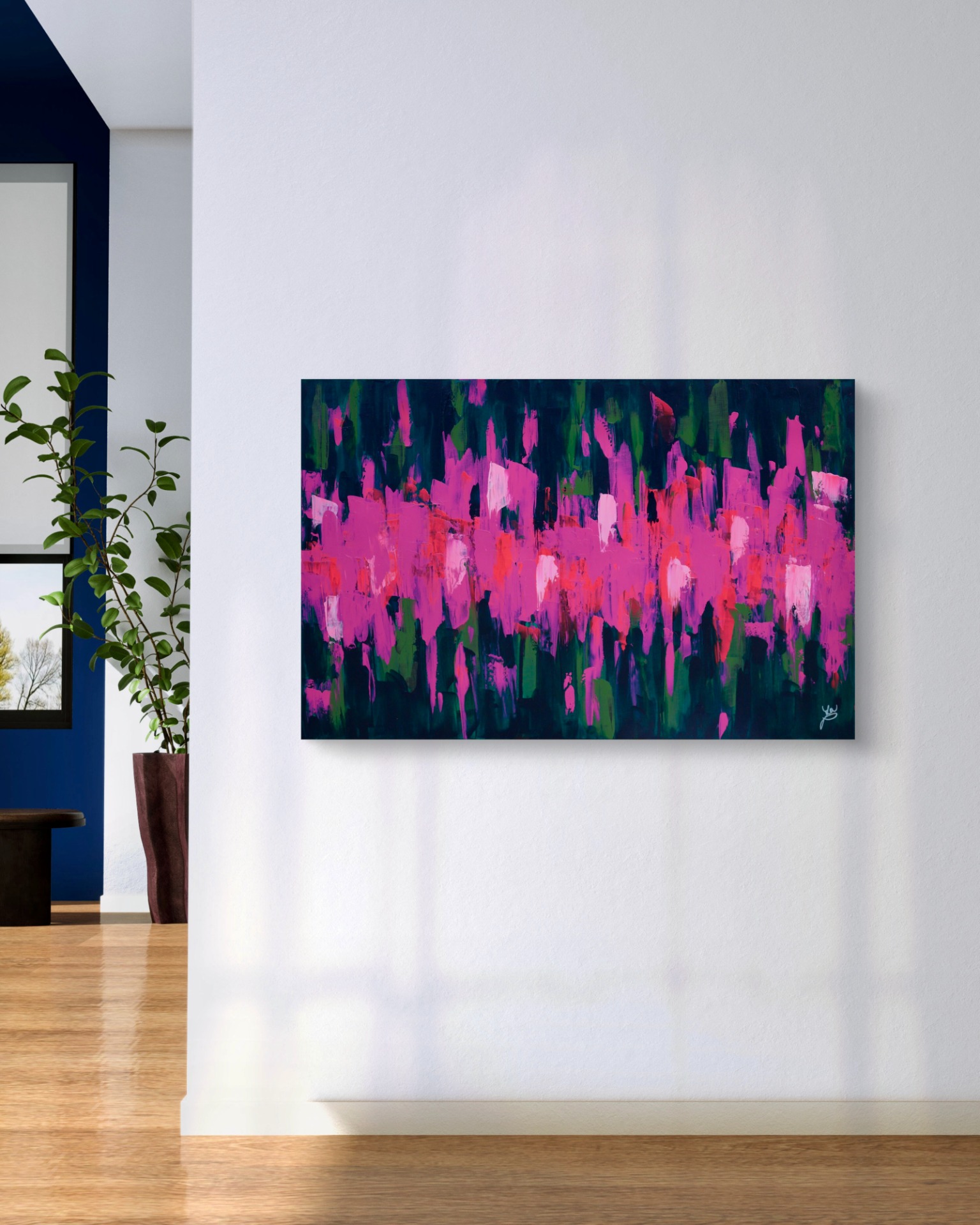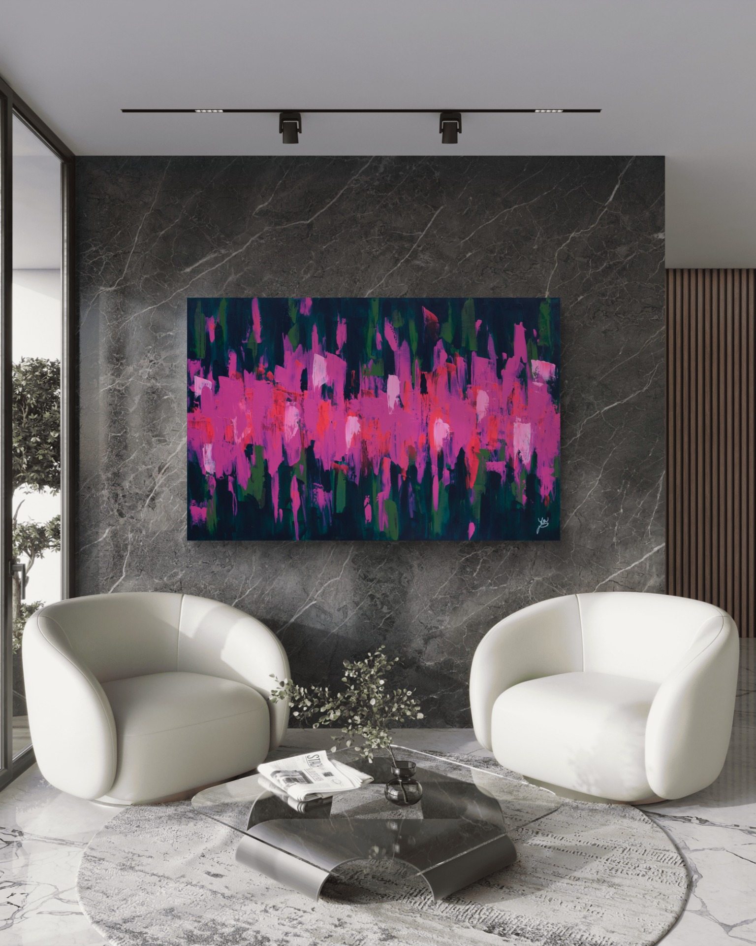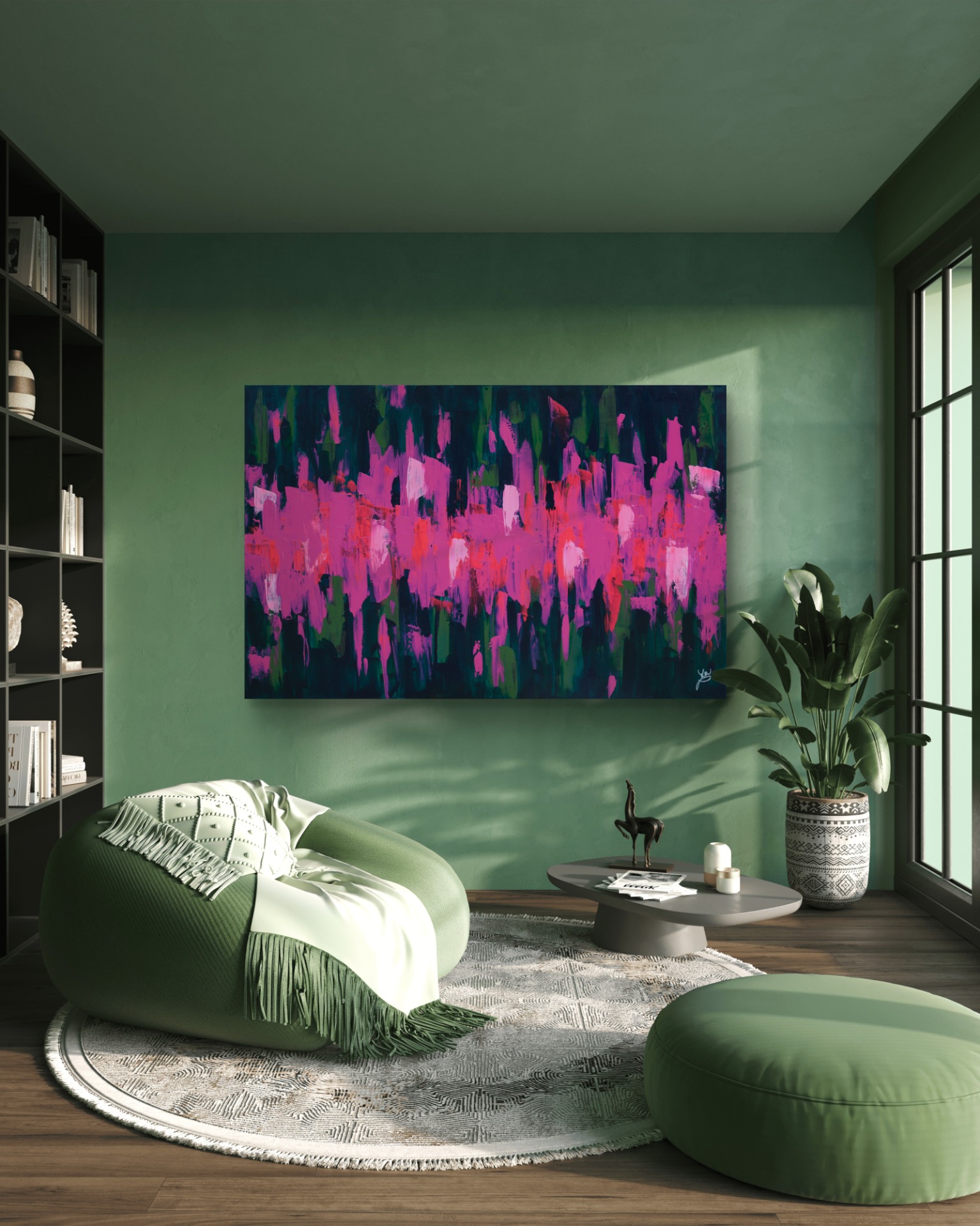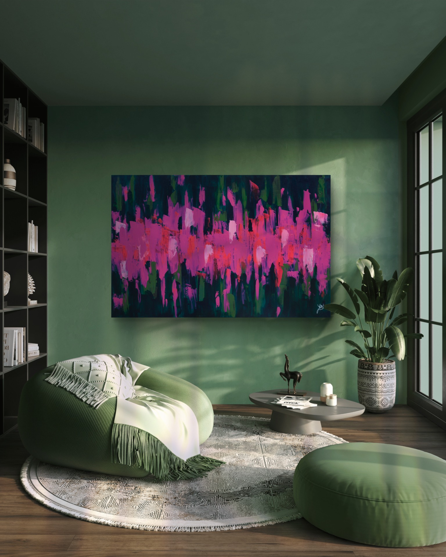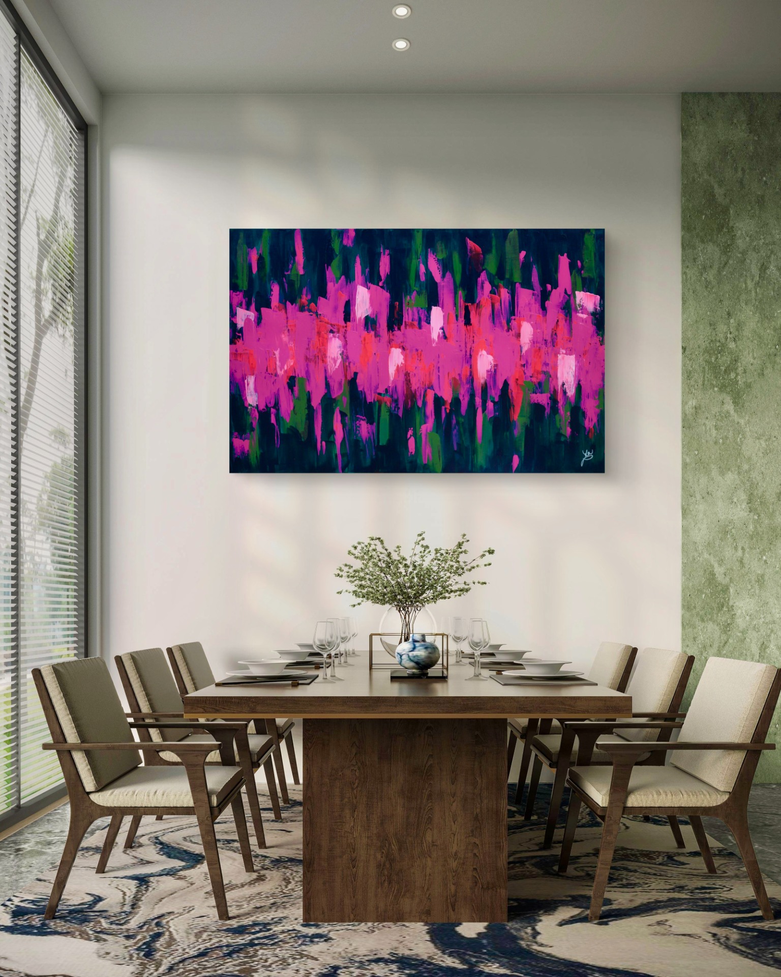 Dominantní barvy: fuchsiová a tmavě zelená.