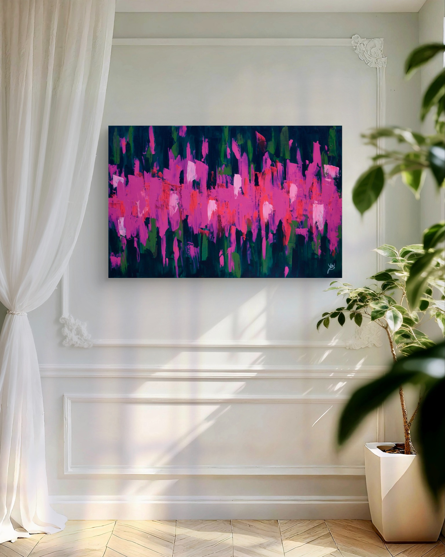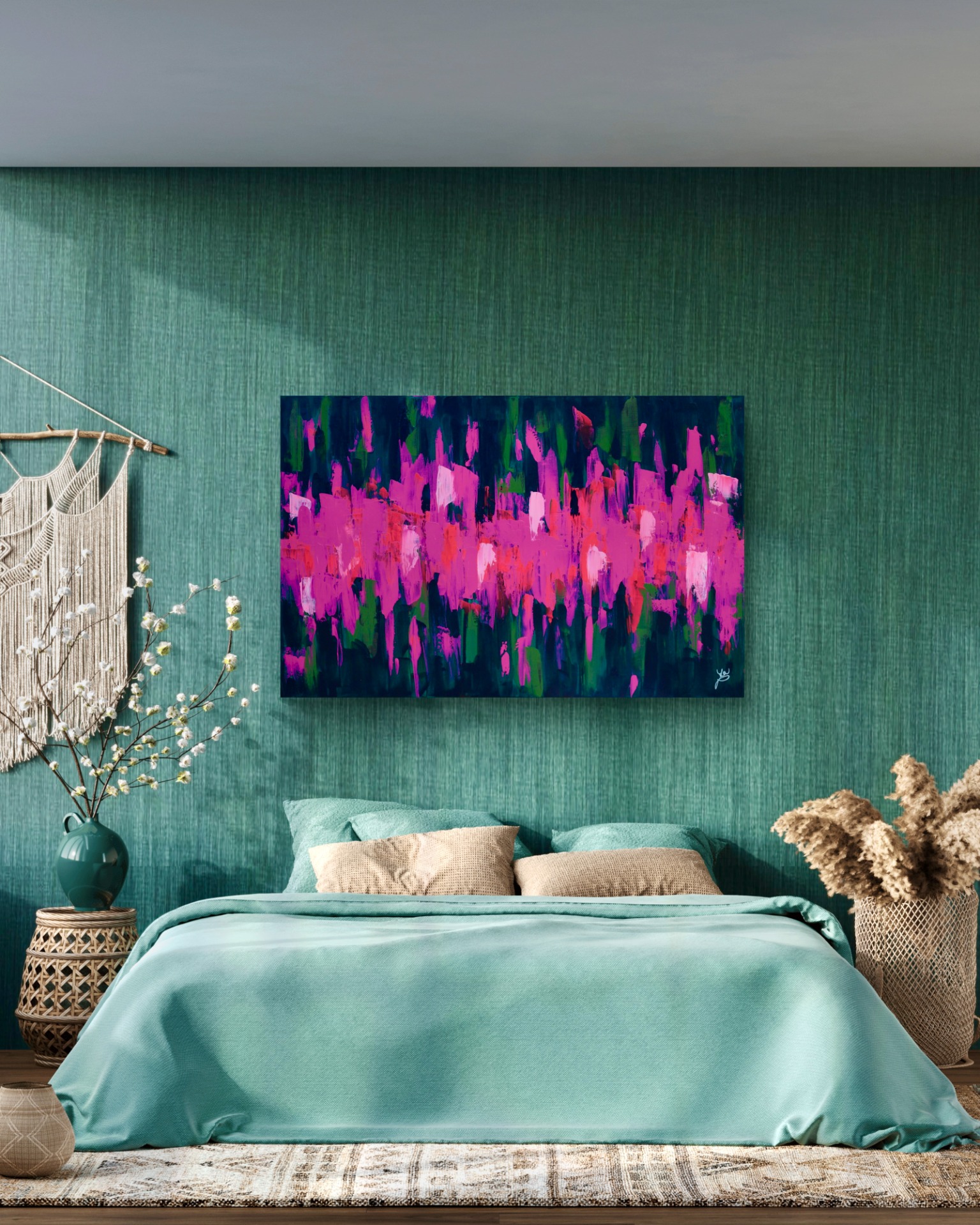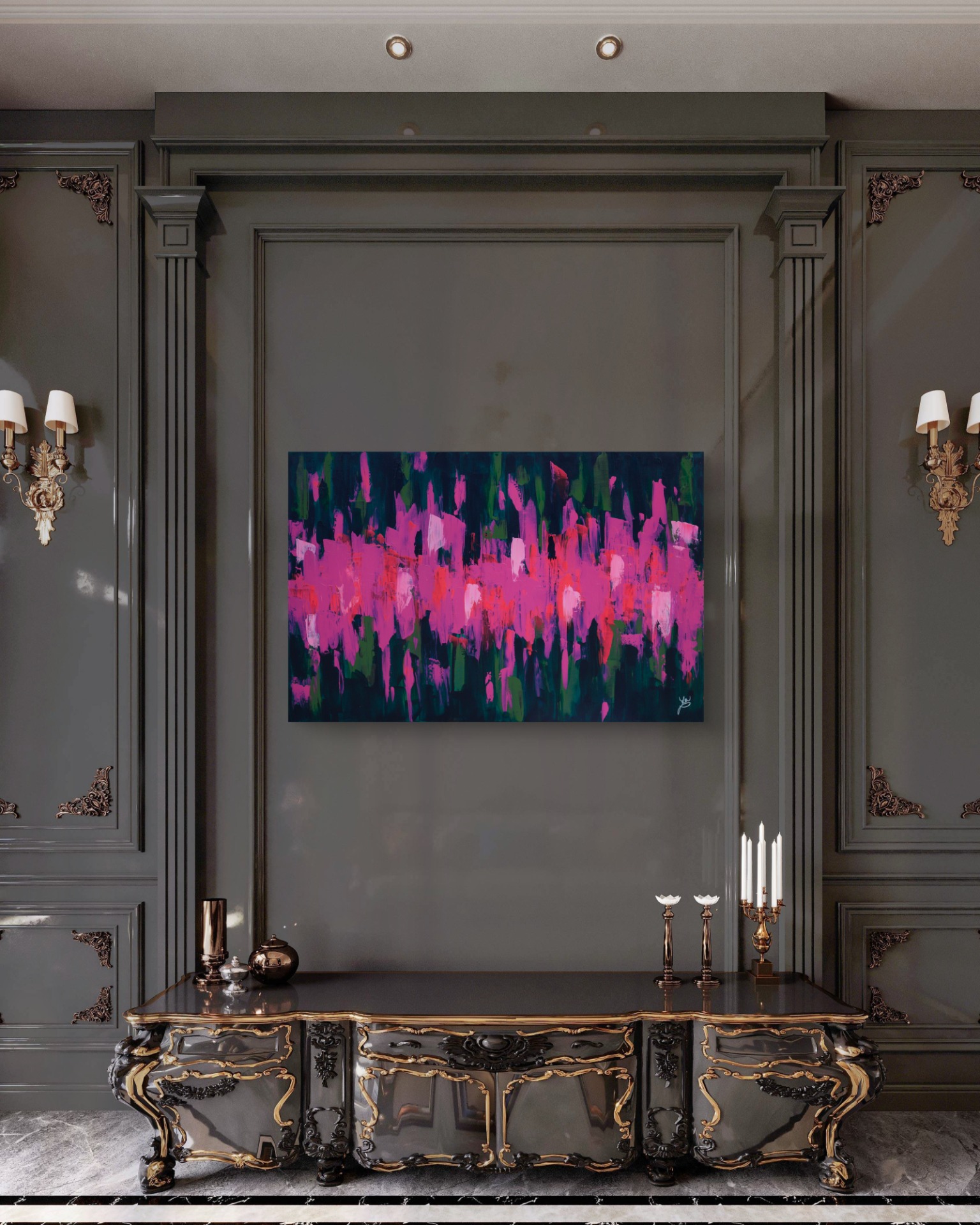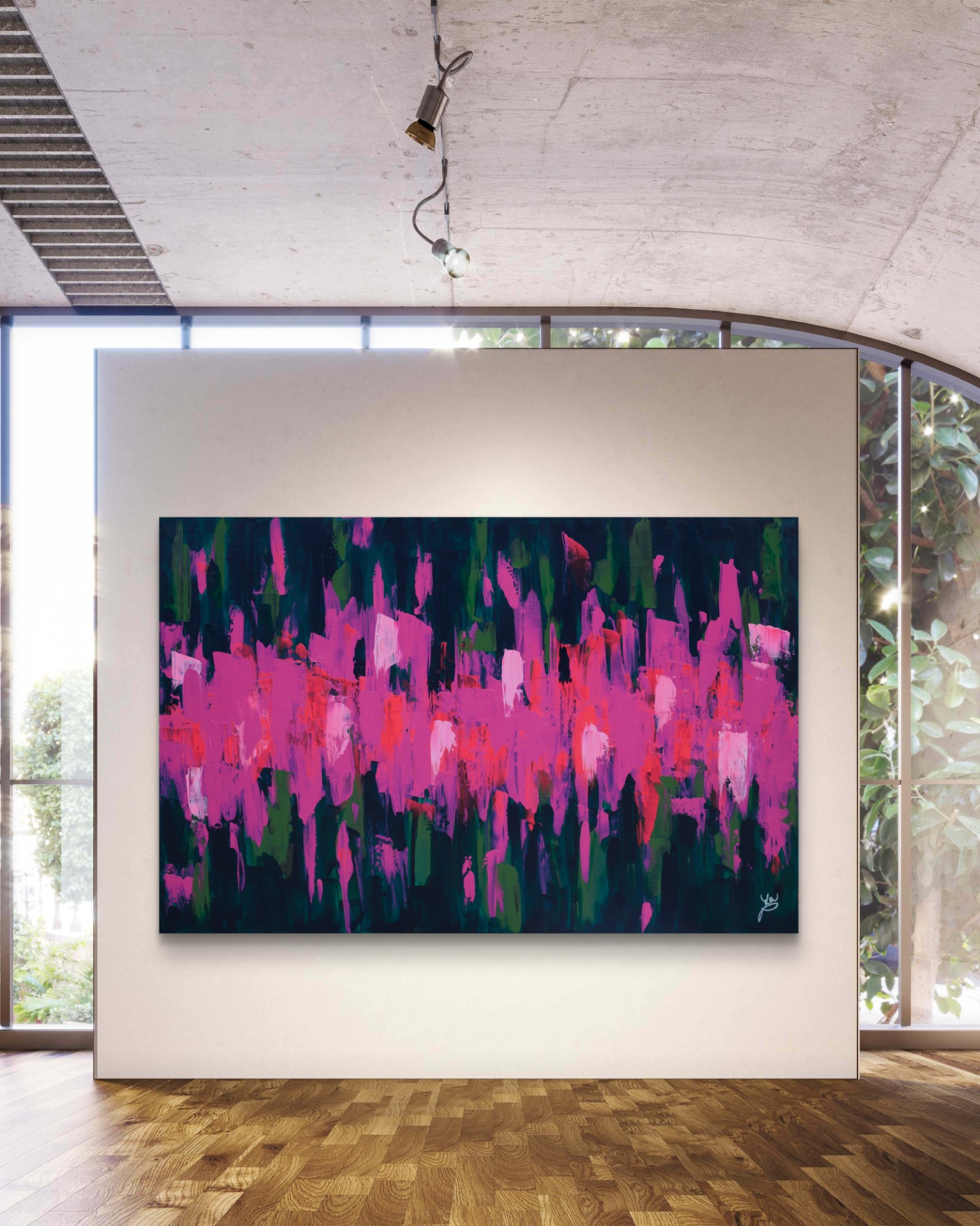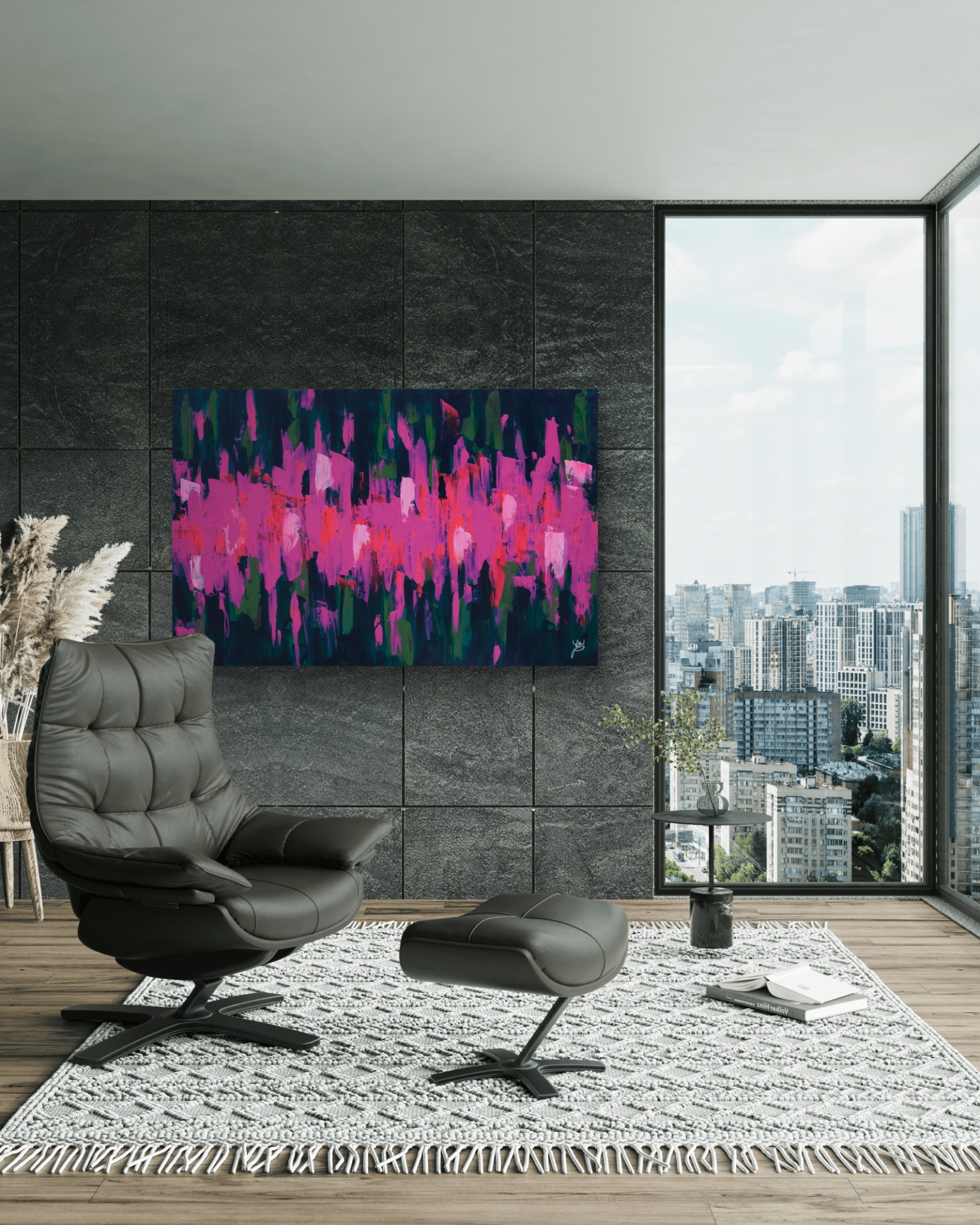 Dominantní barvy: fuchsiová a tmavě zelená.